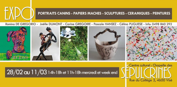 Quoi : Cinq artistes d'horizon divers s'associent le temps d'une exposition. Vous y découvrirez leurs travaux et leurs créations : portraits canins, papier maché, sculptures, céramiques, peintures!