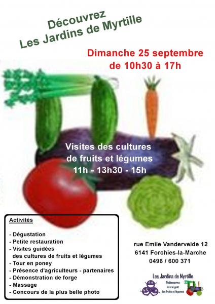 Quoi : Ce dimanche, les Jardins de la Myrtille vous ouvre leurs portes. Découvrez les cultures de fruits et légumes, profitez de la présence d'autres producteurs locaux, des dégustations, de la petite restauration, assistez à des démonstrations de forge. Les petits trouveront quant à eux leur bonheur grâce aux balades en ânes