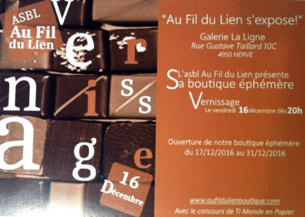 Quoi : Comme chaque année, l'ASBL "Au Fil du Lien" qui parraine des enfants en difficulté organise une boutique éphémère pour la fin de l'année. Vous pourrez y acheter des créations originales d'artistes locaux qui sont vendues au bénéficie de l'association!