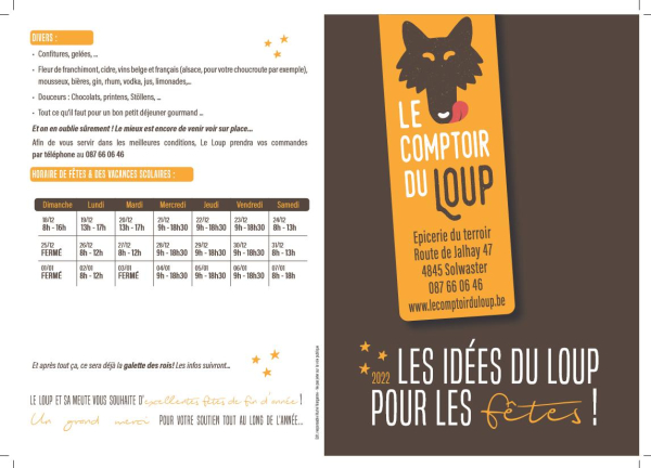 A Solwaster, entre Jalhay et Spa, une nouvelle épicerie du terroir vous accueille depuis novembre 2017 : Le Comptoir du Loup! Dans son magasin, Muriel a réuni de nombreux produits locaux et artisanaux nécessaires à l'alimentation générale : pains, fruits et légumes, produits laitiers (fromages, crème, beurre,...), charcuteries, boissons avec et sans alcool, petit déjeuner (café, thé, miel, confitures,...), pour le plaisir (biscuits, bonbons, chocolats,...)! Une belle gamme de produits sélectionnés avec passion par Muriel chez les artisans du terroir wallon.