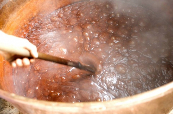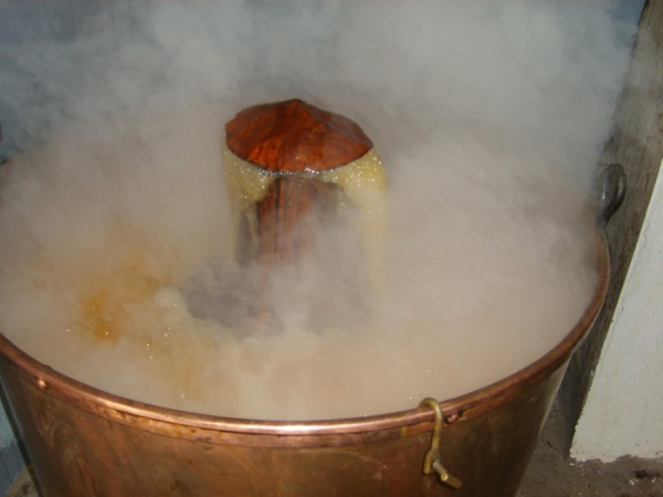 Après leur récolte dans la région, les fruits sont acheminés dans une vieille presse hydraulique qui en extrait le jus, celui-ci cuit ensuite toute une nuit dans une cuve en cuivre chauffée au charbon et au bois. Grâce à la mahette (sorte de spatule en cuivre), l'artisan peut déterminer la consistance du mélange, qui terminera sa course dans le bac de refroidissement avant d'être mis en pot. Près de 24h de préparation pour obtenir un sirop aux arômes légèrement caramélisés.